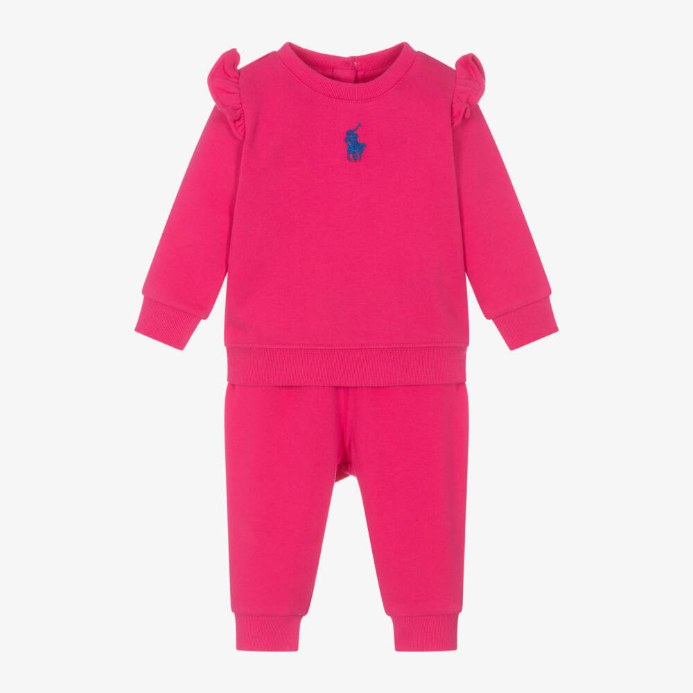 A fuchsia pink tracksuit for baby girls by Ralph Lauren, made in a soft cotton jersey blend with recycled fibres. The long-sleeved sweatshirt is embroidered with the brand's signature Big Pony logo in blue and has cute ruffles decorating the shoulders. Buttons fasten on the back of the top and a faux drawstring details the matching joggers. A coordinating pony motif is stitched on the front of the joggers for a sweet branded finish.