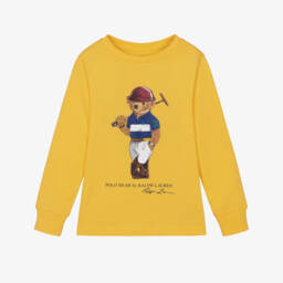 From Ralph Lauren, a bright red long-sleeved top for baby girls. Made in luxuriously soft cotton jersey for comfort and with button fastenings on the back, this lovely top has a sweet Polo Bear print.
