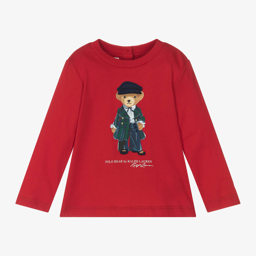 From Ralph Lauren, a bright red long-sleeved top for baby girls. Made in luxuriously soft cotton jersey for comfort and with button fastenings on the back, this lovely top has a sweet Polo Bear print.
