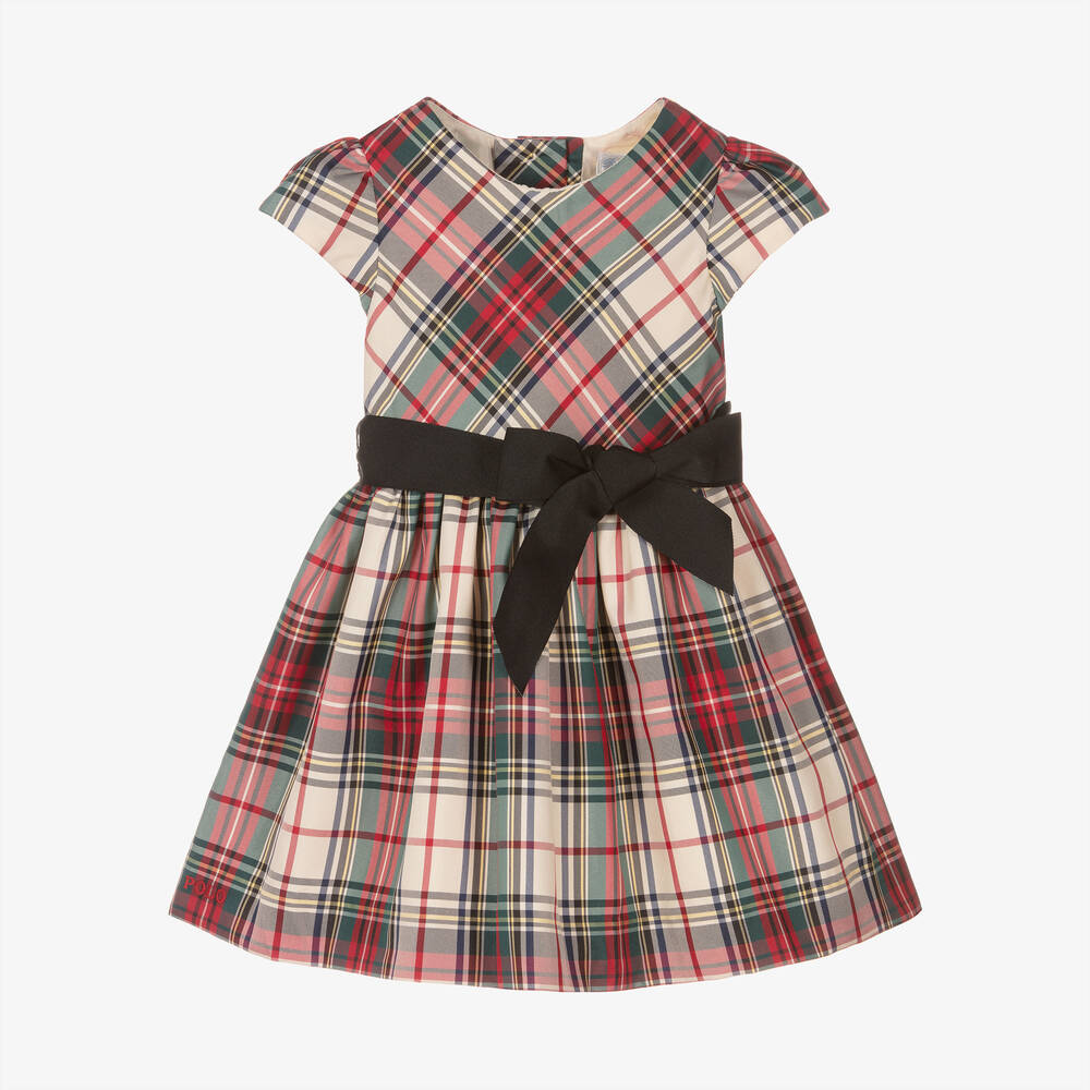 Traditional red tartan dress for baby girls by Ralph Lauren, made in soft satin twill. Capped sleeves add a cute touch to the simple bodice, which flows beautifully into the gathered skirt. Fabric-covered buttons on the back elegantly fasten the dress, and a satin sash belt around the waist complements the silhouette. It comes with matching knickers to complete the look.