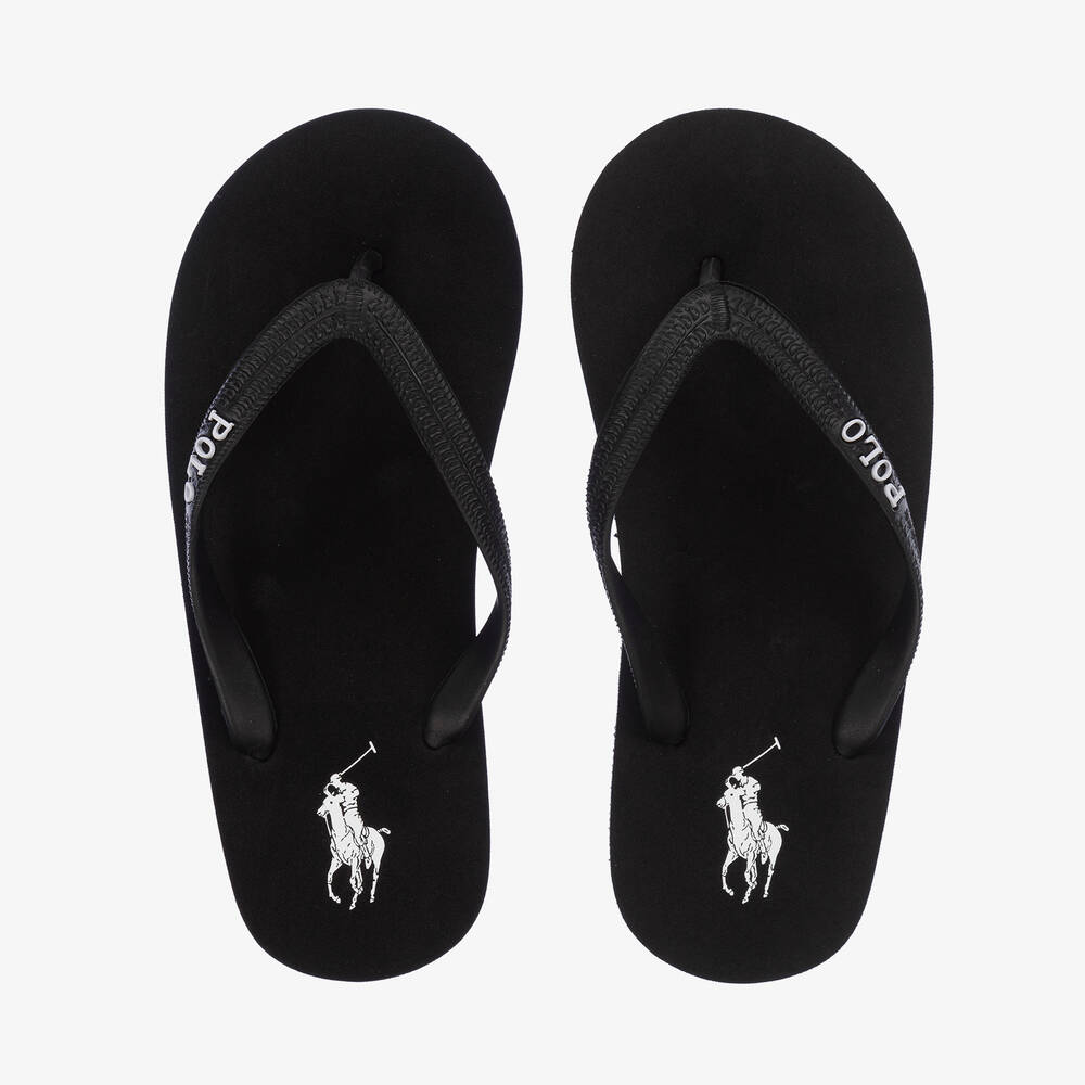 Black flip-flops for boys and girls by Ralph Lauren, ideal for casual resort wear. Easy to slip on, they are printed with the brand's signature white pony logo on the insole and have a raised white logo on the strap. A non-slip rubber outer sole helps to improve grip on slippery surfaces.