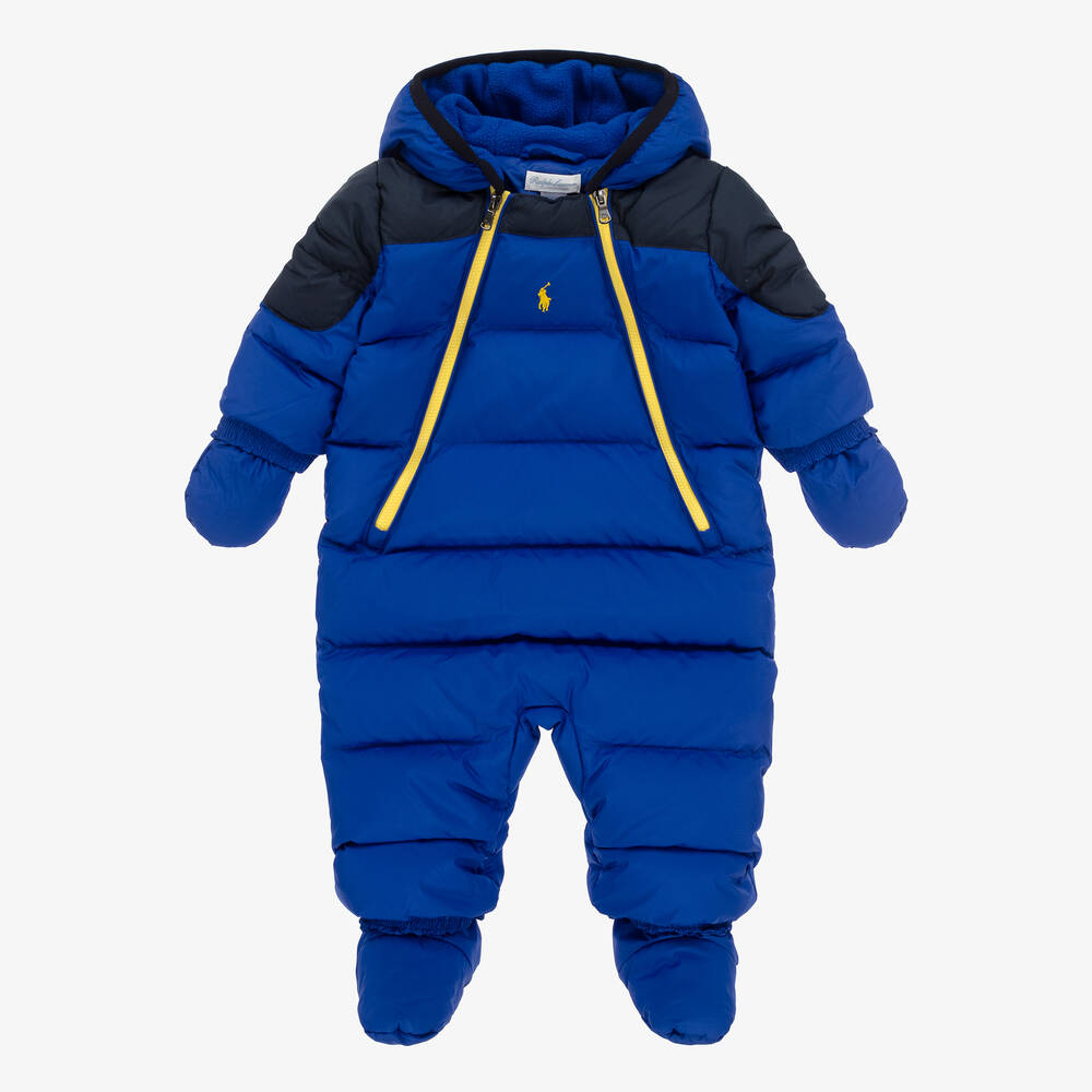 Bright blue padded snowsuit for baby boys and girls by Ralph Lauren. Made in silky smooth, water-repellent and recycled fabric, it is down-padded for lightweight warmth without weight. For added cosiness, the padded hood has a soft polar fleece lining, and the snowsuit comes with fleece-lined mittens and booties that are elasticated for comfort and attach to the suit with poppers. For a designer finishing touch, the brand's signature pony logo is embroidered on the chest in yellow to match the double zip fastening.