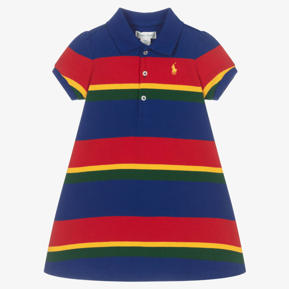 Baby girls blue striped dress and knickers set by Ralph Lauren, made in soft cotton piqué. The lovely polo dress has red, green, and yellow stripes, with an embroidered yellow signature pony logo on the chest. It comes with matching knickers that have elasticated trims for comfort.