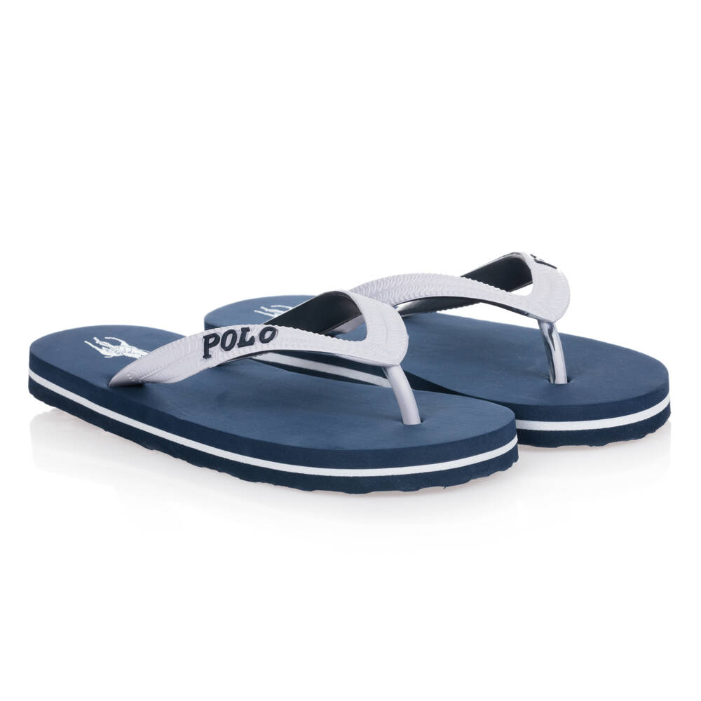 White and navy blue flip-flops for girls and boys by Polo Ralph Lauren, printed with the brand's signature white pony logo on the insole. They have a raised navy blue logo on the upper strap and embossed pony logos on the sole.