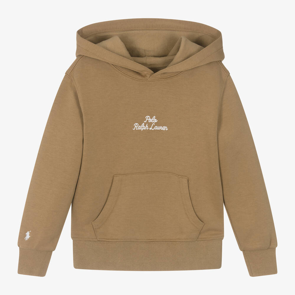 Casual beige cotton hoodie for boys by American brand Ralph Lauren, made in soft, comfortable jersey for relaxed days. It has a useful pouch pocket on the front and ribbed trims. For a designer finish, there is a central logo on the front and the signature pony logo on one cuff, both embroidered in white.