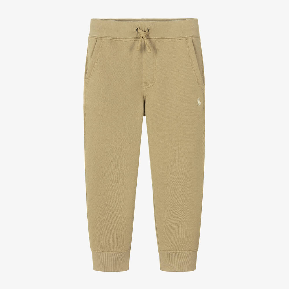 Casual beige joggers for boys by American brand Ralph Lauren, made in comfortable cotton jersey with a cosy fleece feel inside. Designed for comfort, they have an elasticated waistband with a drawstring tie for an adjustable fit and soft ribbing on the ankles. There are slanted pockets on the front and the signature pony logo is embroidered in white for a distinctive touch.