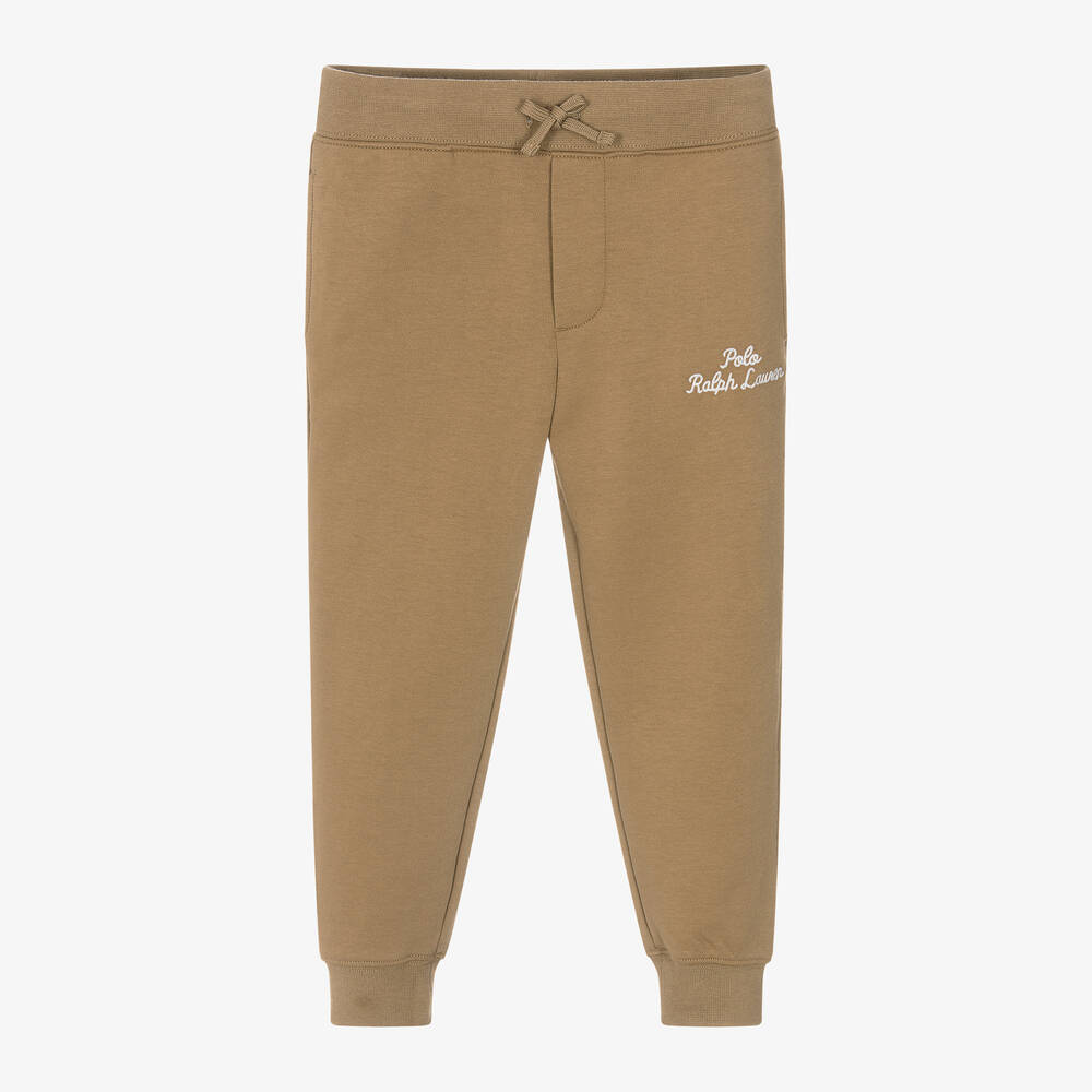 Beige cotton joggers for boys by American brand Ralph Lauren, made in soft, comfortable jersey for relaxed days. They have a drawstring waist for an ideal fit, useful side seam pockets and ribbed cuffs. A white, chain-stitched logo on one leg gives instant designer appeal.
