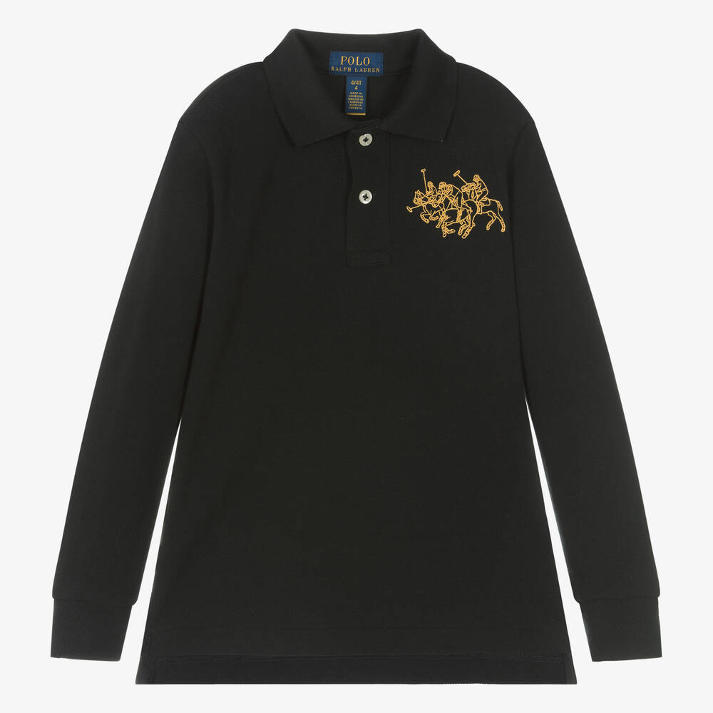 A black Mini-me long-sleeved polo shirt for boys by Ralph Lauren. Designed to celebrate the Lunar New Year, the pointed collar has a classic tartan pattern on the underside and there is a gold Triple-Pony logo embroidered on the chest. Made from soft cotton piqué, it has pearlescent button fastenings on the front and vents on the side seams.