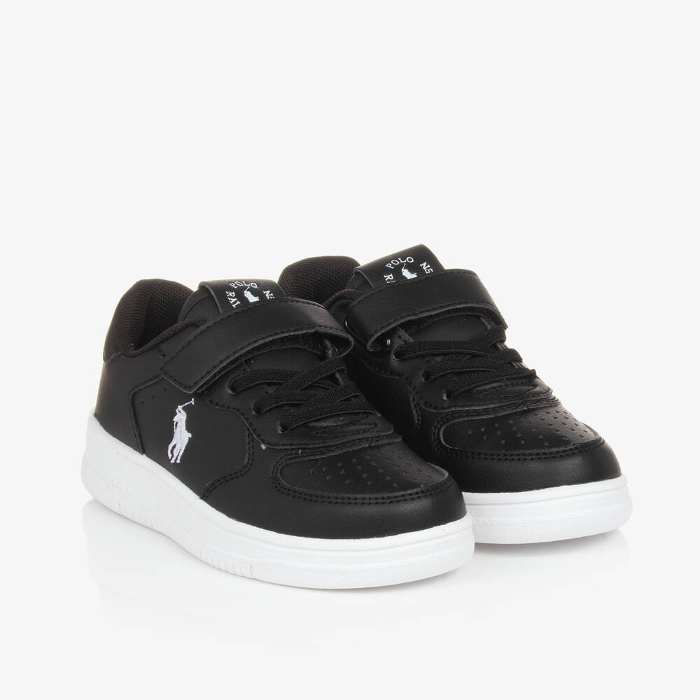 Black faux leather trainers for boys by Ralph Lauren, with elasticated laces and a velcro-fastening strap across the foot. Lined in soft, breathable mesh, they have a padded insole for comfort and the signature pony logo embroidered on one side in white for instant brand recognition. There is further logo detailing on the tongue, heel and side of the non-slip rubber outer soles.