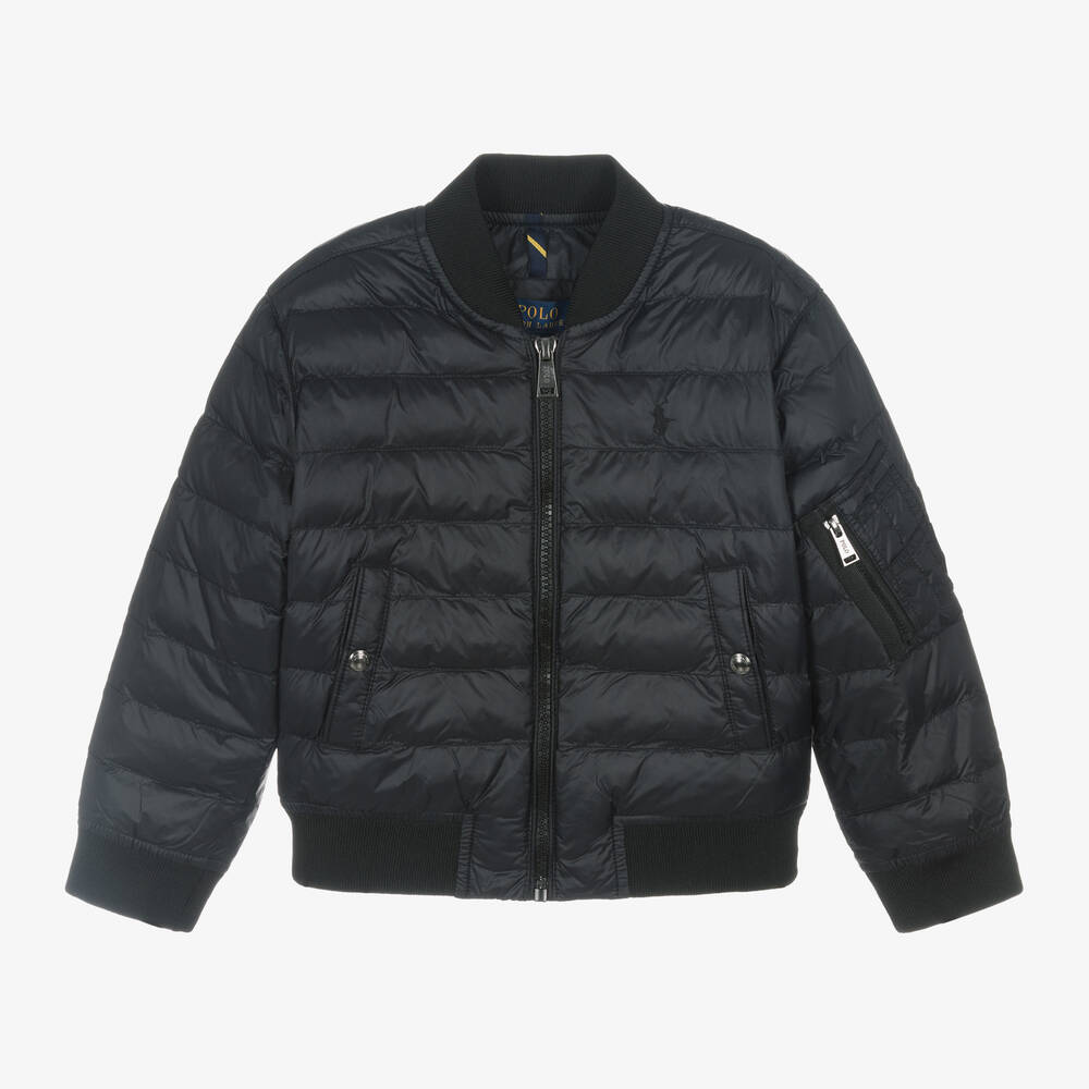 A black puffer jacket for boys from Ralph Lauren, made and lined in silky, recycled fabric. This bomber-style jacket is filled with soft, super-lightweight and recycled padding. It is treated with a water-repellent finish to help keep him cosy and comfortable. The elasticated trims trap in warmth, the popper-closing pockets are great for small essentials, and the front zip closure is signed with branding for extra designer appeal. One sleeve has an additional zip-up pocket and the pony logo is embroidered subtly on the chest to complete the look.