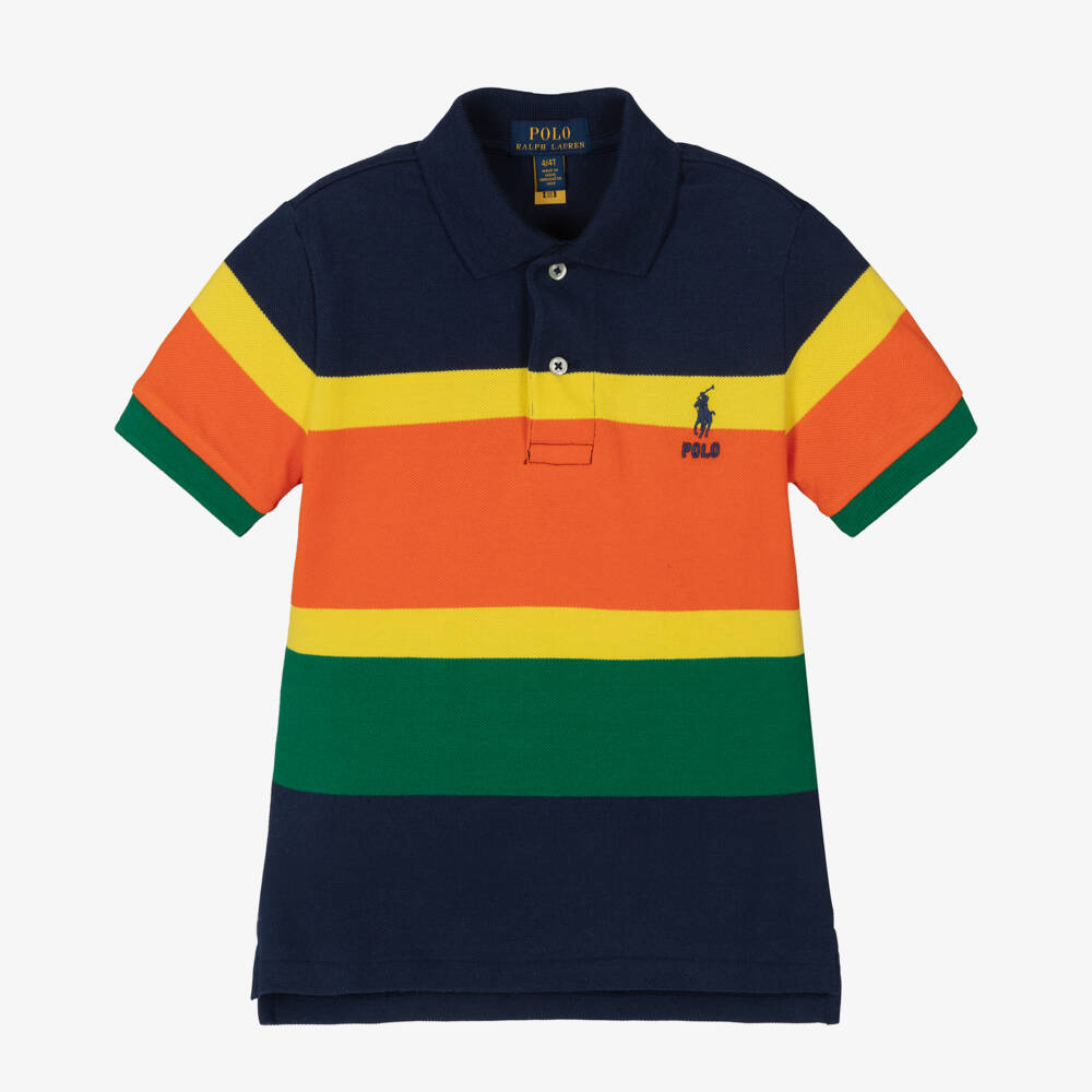 Boys blue striped polo shirt by Ralph Lauren, with navy blue polo logo embroidery. Made in soft and stretchy cotton piqué, this colourful shirt has colourblock stripes in yellow, orange and green with front buttons to fasten and a ribbed collar.