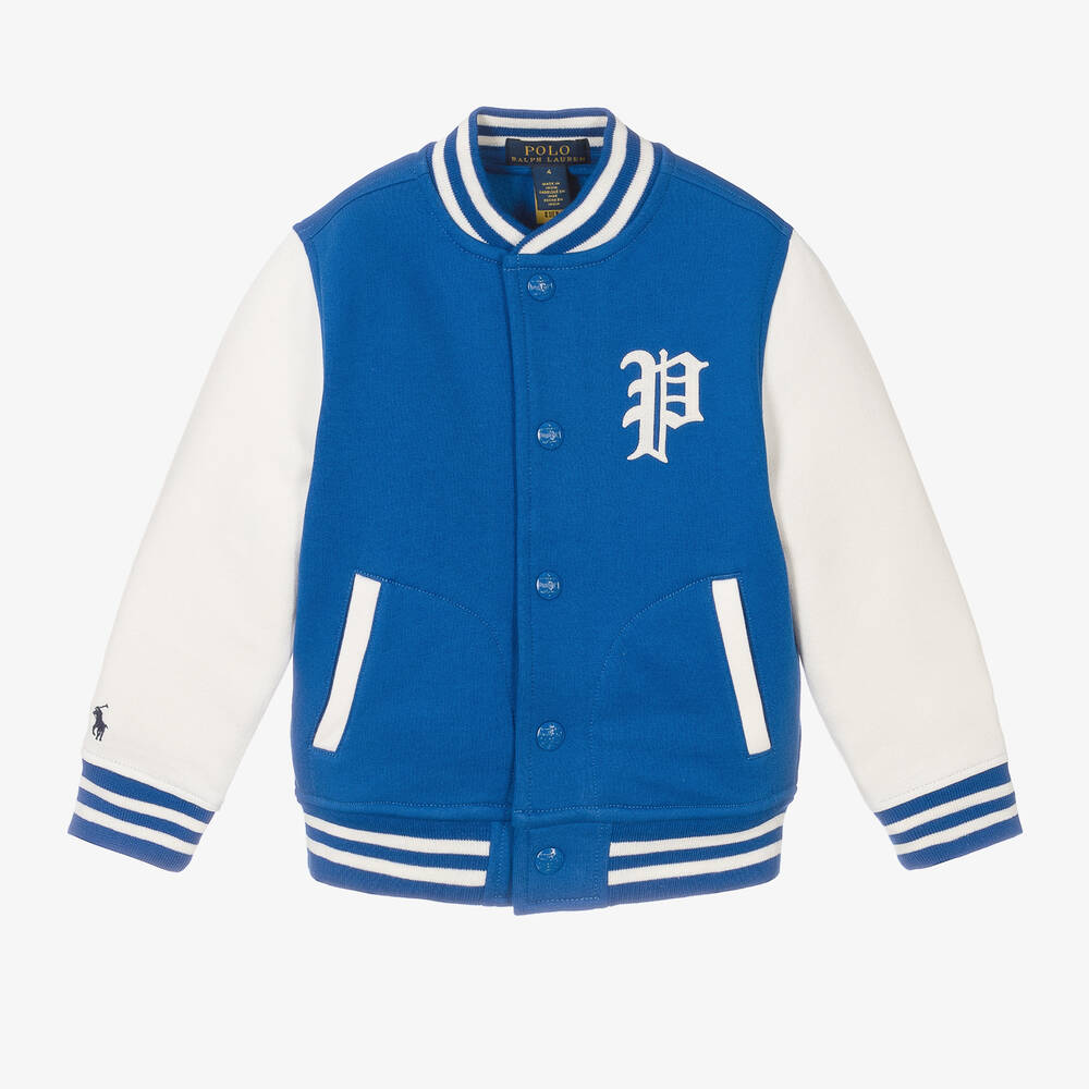Royal blue cotton letterman jacket for boys by American brand Ralph Lauren, with ivory sleeves. It has a ribbed collar and cuffs, striped in ivory, with a felted, varsity-inspired "P" appliqué on the chest, as well as the designer's signature embroidered pony logo on one sleeve. Both comfortable and cosy, it is made in mid-weight jersey with a warm fleecy inside and front pockets. It fastens with branded poppers on the front.
