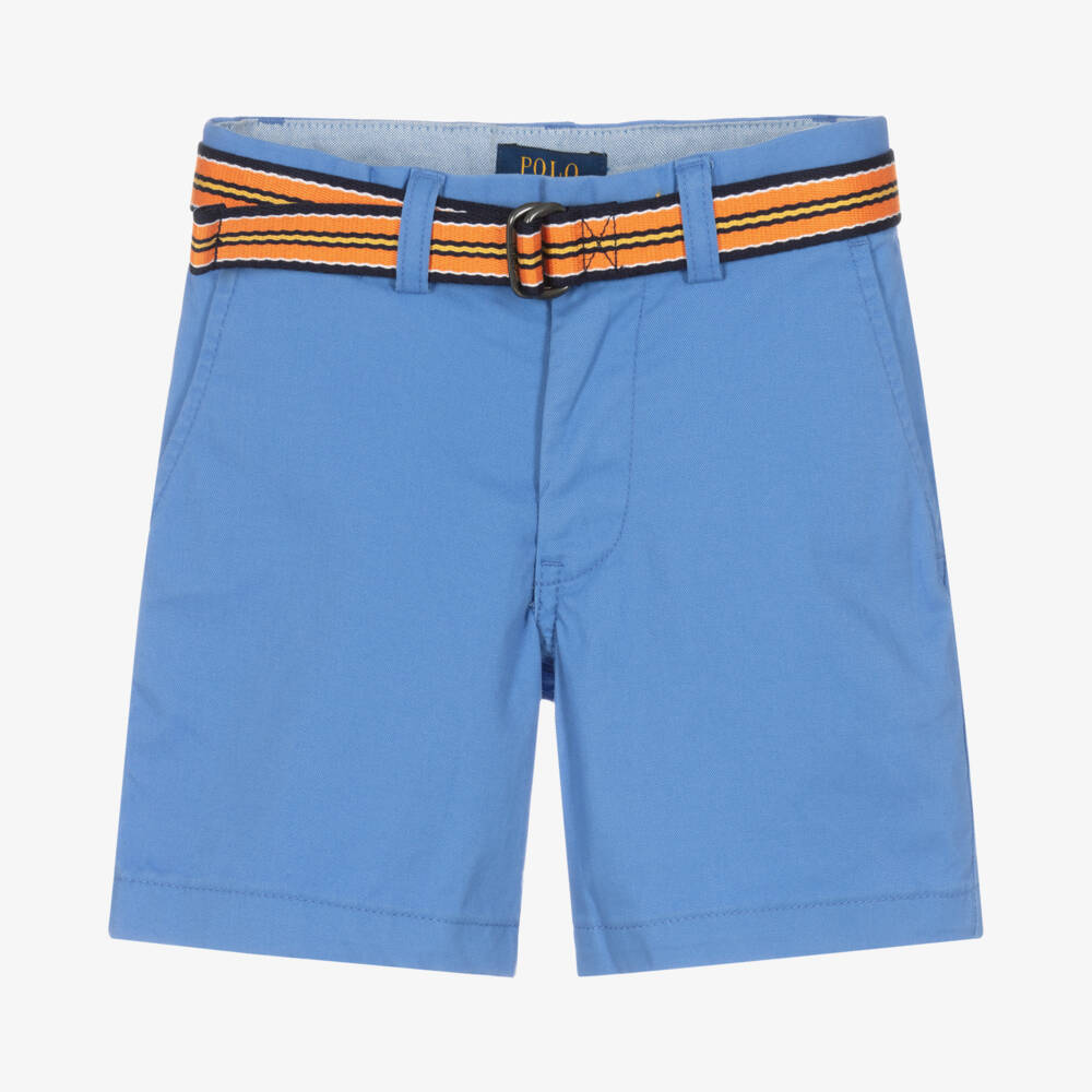 Blue chino shorts for boys by Ralph Lauren, embroidered with the iconic navy blue pony logo. In a skinny fit, they are made in soft cotton twill with durable stretch, wrinkle-resistant and abrasion-withstanding qualities for optimum comfort. They have a zip and button closure, with four-pocket styling. The adjustable waistband offers convenience and ease of comfort. Pair with the matching woven belt to smartly finish off the outfit.