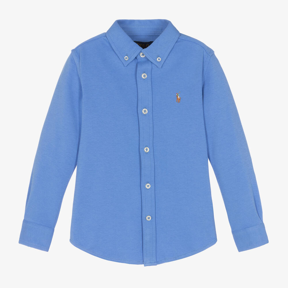 A blue long-sleeved shirt for boys by Ralph Lauren, made from soft cotton jersey for comfortable wear. It is designed with a smart button-down pointed collar and pearlescent button fastenings on the cuffs and down the front. The brand's iconic pony logo is embroidered on the chest for a signature finish.