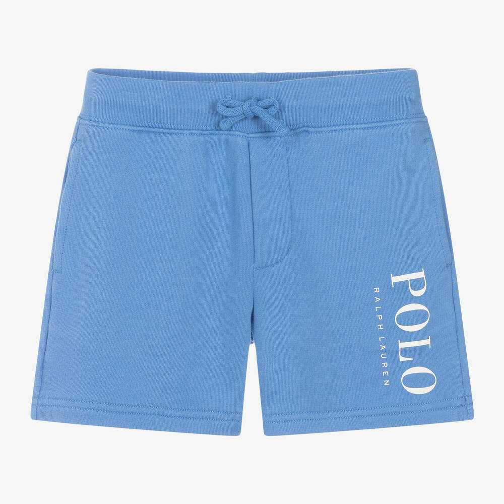 Sporty pale blue cotton Mini-me shorts for boys by American brand Ralph Lauren, with a bold white logo printed on one leg. Super comfortable and ideal for laid-back lounging, they are made in soft, comfortable, cotton-blend sweatshirt jersey, with a drawstring waist for a good fit and useful side seam pockets. The designer's signature pony logo is embroidered in white on the back pocket.