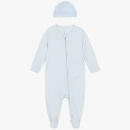 In Ralph Lauren's signature look, this lovely pale blue and white babygrow and hat set for boys features the iconic Pony logo. Both pieces are made in beautifully soft cotton jersey and presented in a smart box for gifting. The babygrow has a two-way zip fastening handy to keep baby cosy during nappy changing. A matching hat with a turn-up brim completes the look.