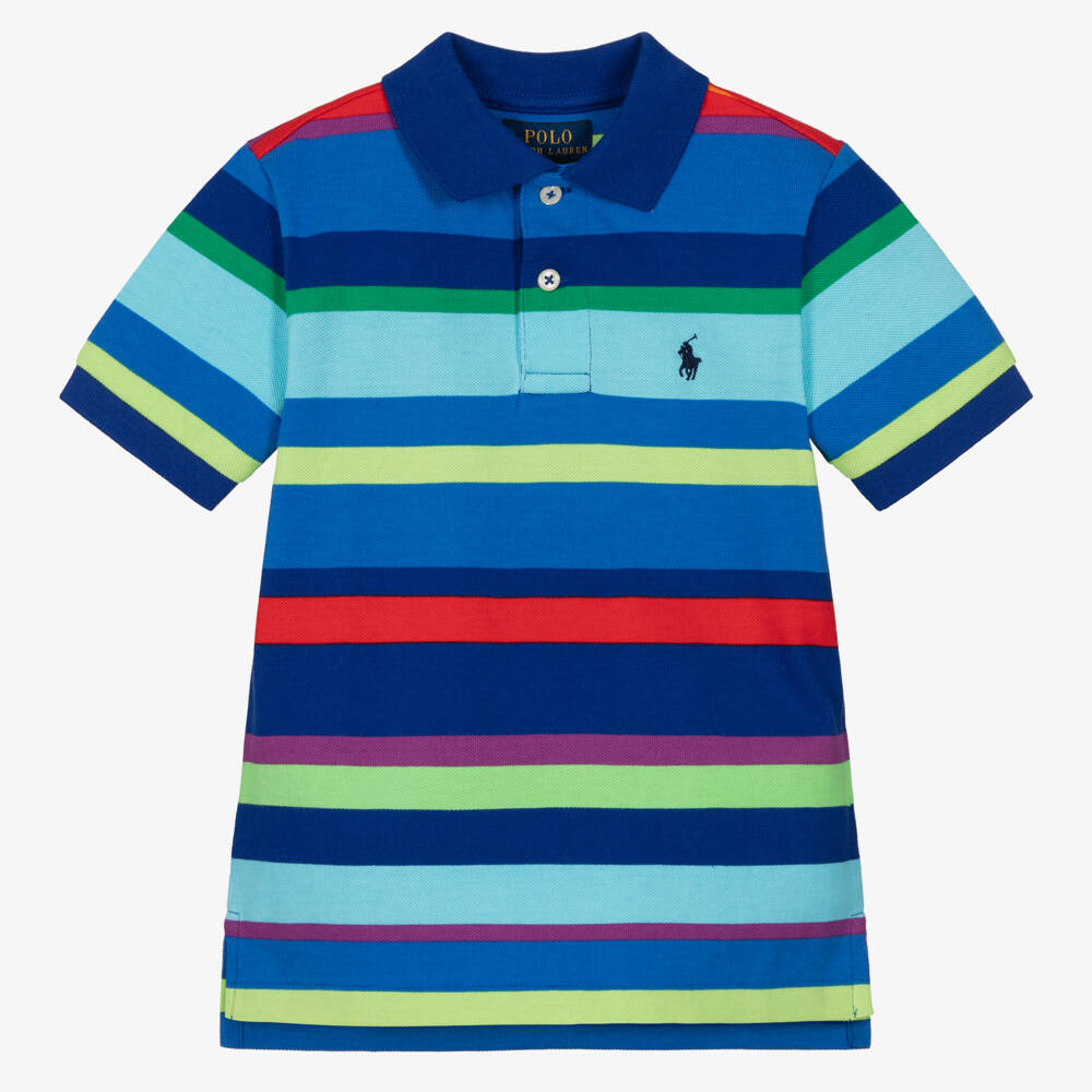 Blue polo shirt for boys by Ralph Lauren, made in soft cotton piqué. Classically styled with button fastenings on the front and a ribbed collar, it is has stripes of green, red and purple and is finished with the signature pony logo on the chest.