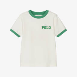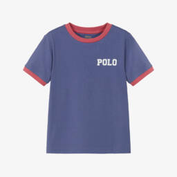 Blue T-shirt for boys by Ralph Lauren, made in soft cotton jersey. Casual and comfortable, it has contrasting red trims and a white varsity-inspired 'Polo' appliqué logo on the front for a signature finish.