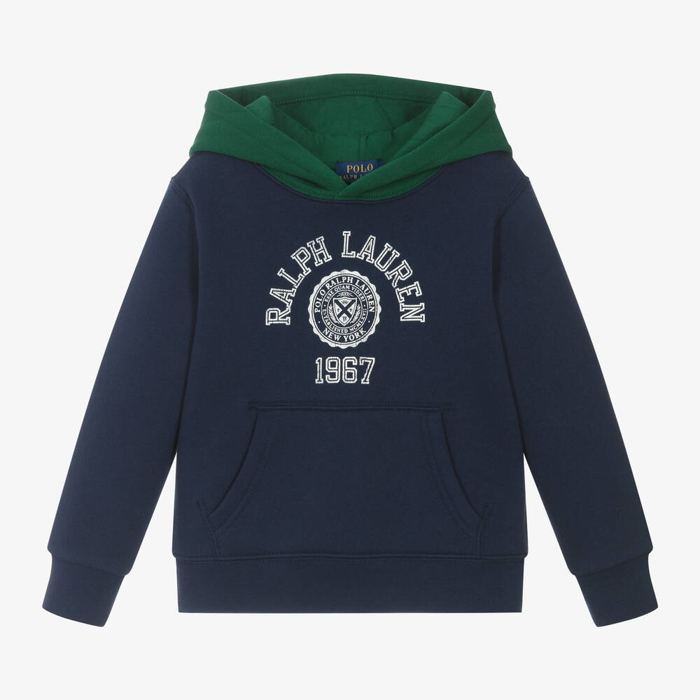 Boys navy blue cotton hoodie by American brand Ralph Lauren, made in soft, comfortable jersey with a warm, fleecy inside. Printed on the front is a distressed white, varsity-style logo, with 1967, the date the brand was founded. It has a cosy hood in green, a useful pouch pocket and neat, ribbed trims.