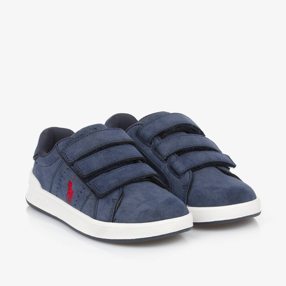 From American brand Ralph Lauren, blue trainers for boys made in smooth faux suede leather. Ideal for quick and easy dressing, they fasten with three velcro straps and the lightly cushioned insole ensures comfort. The brand's signature pony logo is embroidered on the side in eye-catching red.