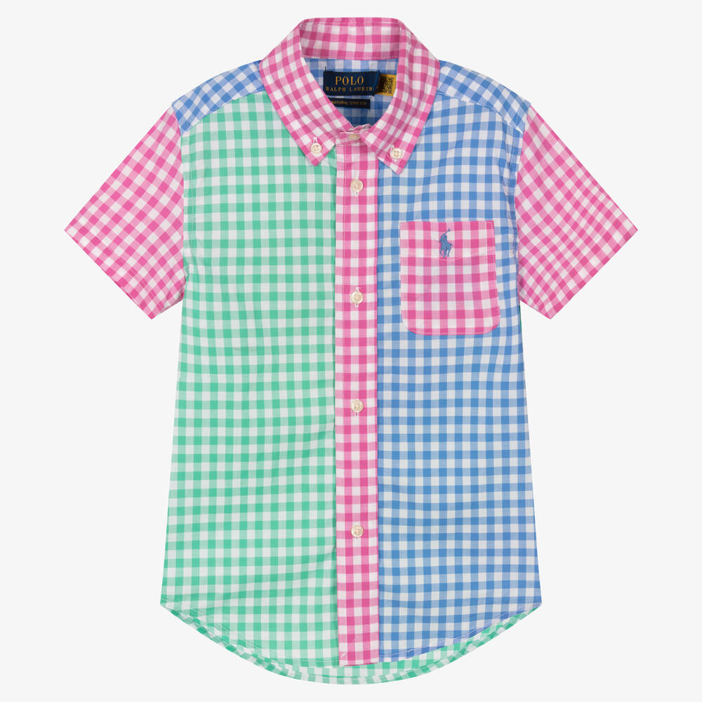 A green, blue and pink check shirt for boys, by Ralph Lauren. Made in soft and breathable cotton poplin, this shirt fastens with buttons on the front for easy, convenient wear. In a smart-casual style, there is a pocket on the front with an embroidered signature pony logo.