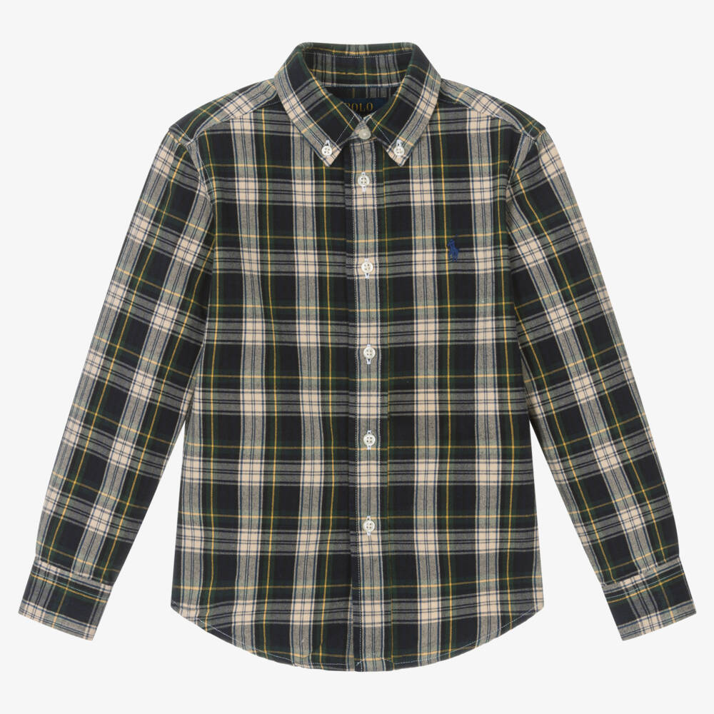 Casual Oxford cotton tartan shirt for boys by American designer Ralph Lauren, in green, navy blue and yellow. Washed to make it soft and super comfortable, it has a button-down collar, with matching button fastenings on the front and cuffs. The brand's signature pony logo is embroidered on one side in navy blue.