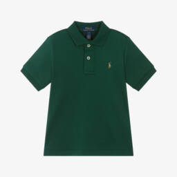 Green and navy blue striped polo shirt for boys by Ralph Lauren, made in soft cotton piqué. In a classic style, it has a two-button placket and side vents for ease of movement. The brand's signature pony logo is embroidered on the chest in contrasting red.