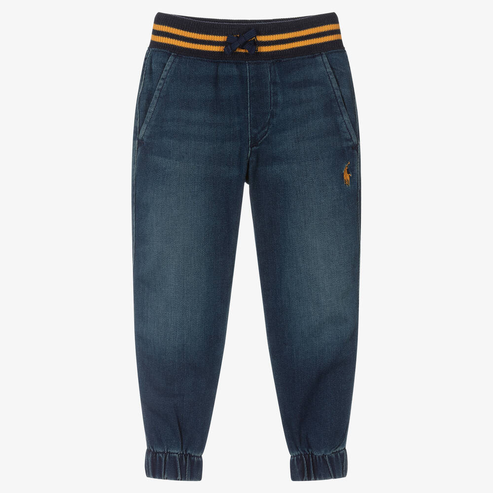 Comfortably uniting soft stretch cotton denim with a sporty silhouette, these cuffed joggers for boys are by Polo Ralph Lauren. The ribbed knit waistband has navy blue and yellow stripes and a drawstring tie for an adjustable fit. They have slanted front pockets, a back patch pocket and an embroidered signature pony logo on one leg.