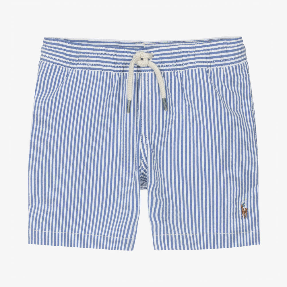 Classic navy blue and white striped seersucker swim shorts for boys by Ralph Lauren, with the signature Pony logo embroidered on the front. They are made in a lightweight and stretchy cotton blend with comfortable mesh lining and an elasticated drawstring waistband. There are pockets on the side seams and a button-fastening pocket with a logo tab on the back.