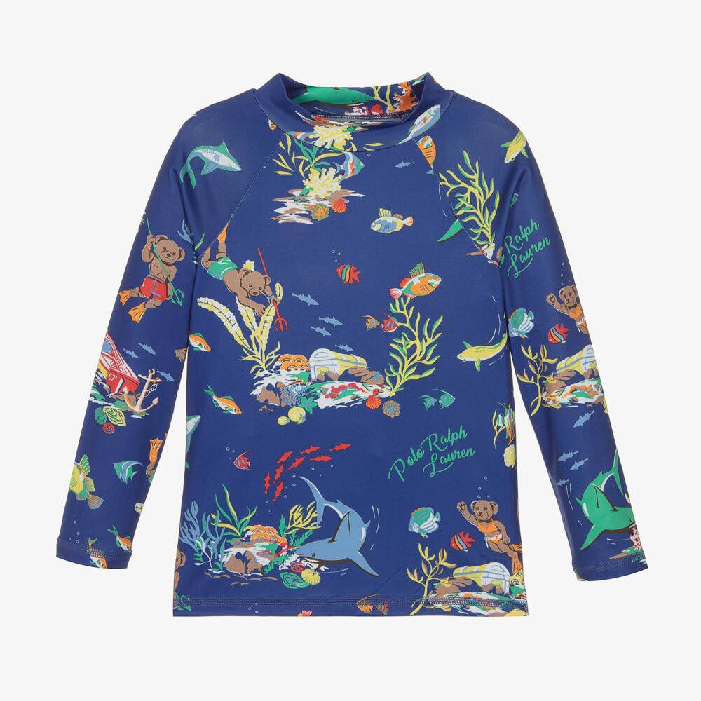 Blue sun protective top for boys by Ralph Lauren, with UPF50. It has a fun print of the instantly recognisable Polo Bears exploring under the sea. This silky, stretchy rash vest is designed with moisture wicking properties in order to keep the wearer cool, dry and comfortable.