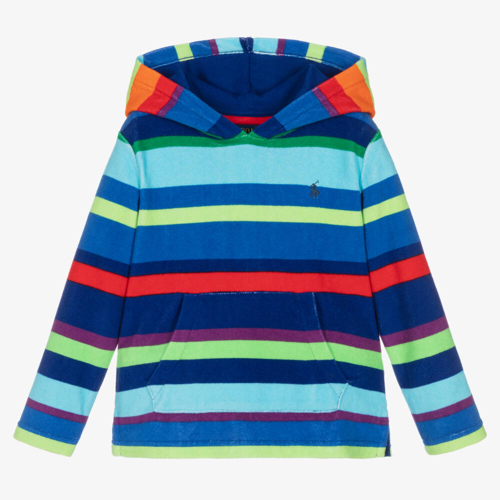 Blue hooded top for boys by Ralph Lauren, made in soft terry towelling. Striped with hues of green and red for a burst of colour, this cool top has a lined hood and pouch pocket on the front for added comfort. The signature pony logo is embroidered on the chest for brand recognition.