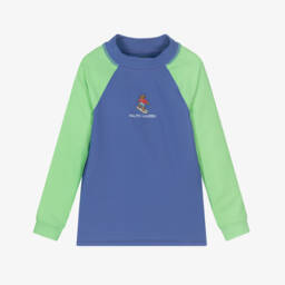 Blue tie-dye sun hat for boys by Ralph Lauren, made in cotton twill. This casual hat features a playful tie-dye design and an embroidered motif of the iconic Polo Bear surfing. Ideal for sunny days, it has a wide brim for added protection.