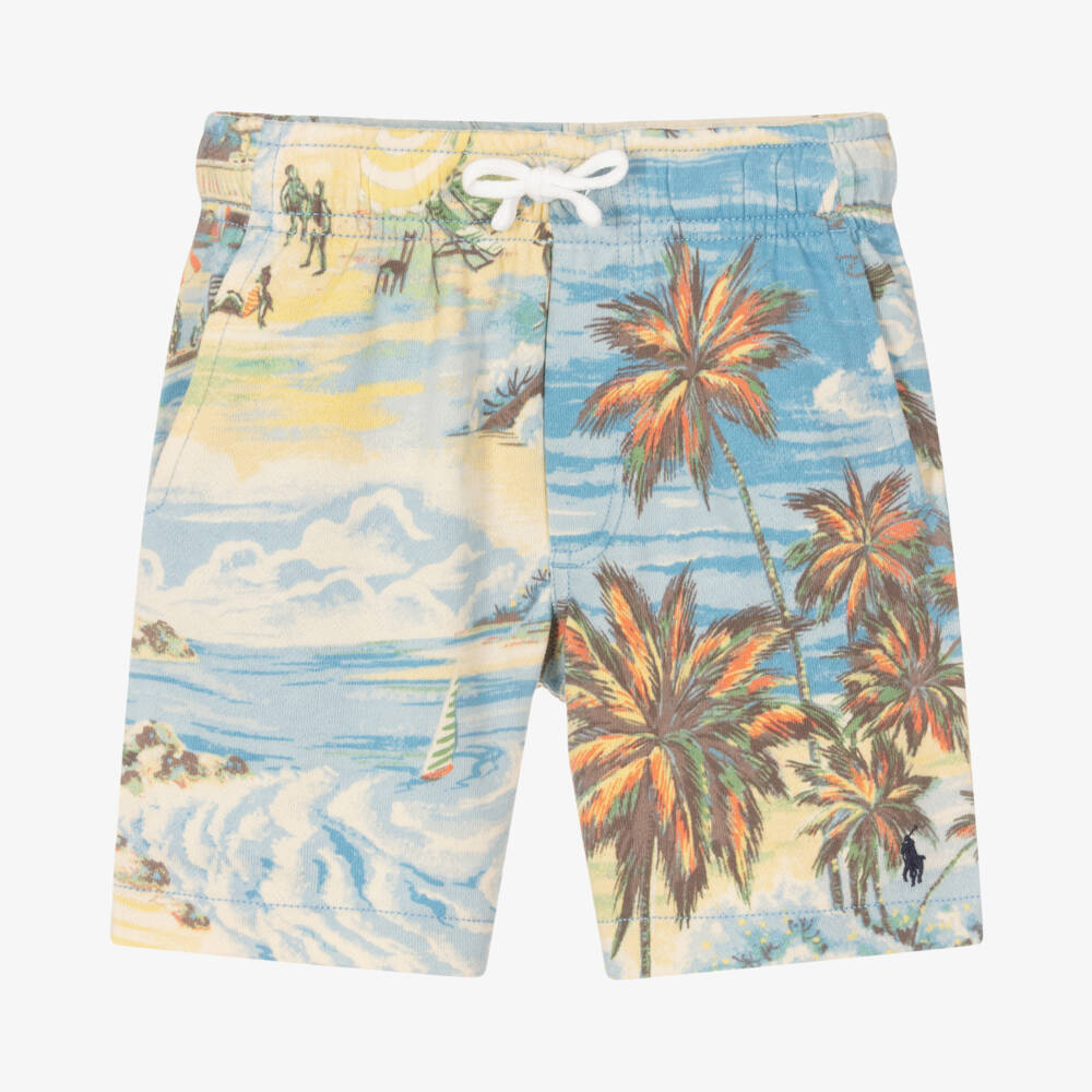 Fun blue shorts for boys by Ralph Lauren, made in soft cotton sweatshirt jersey. Patterned in a colourful tropical island print with palm trees and blue skies, this seasonal style has a drawstring waist for comfort and relaxed slanted pockets on the sides. The brand's pony logo is embroidered near the hem in navy blue, signing off the look with a recognisable code.