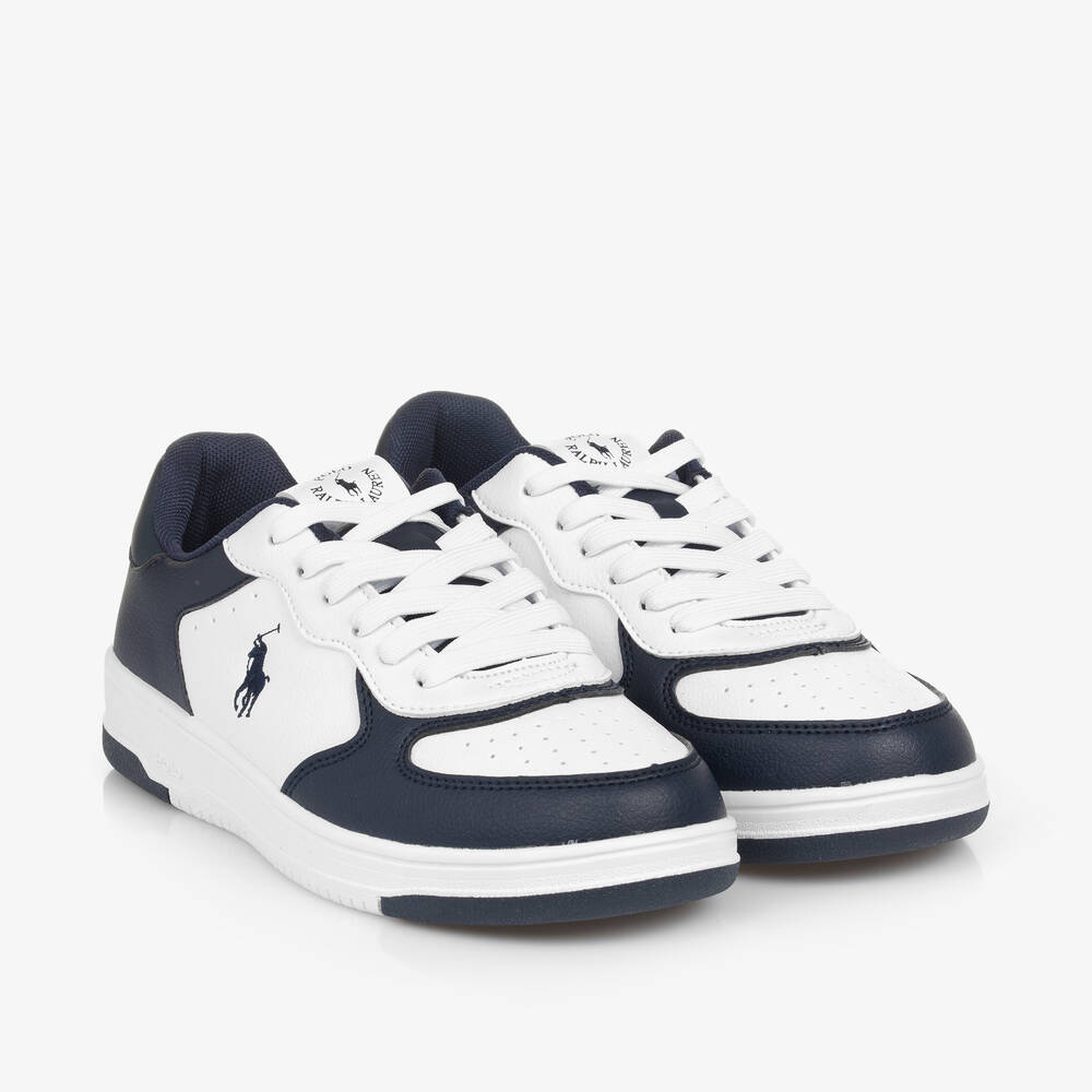 A pair of navy blue and white faux leather trainers for boys by Ralph Lauren, with the signature pony logo embroidered on the side. The white rubber sole is non-slip and flexible, the insole is lightly cushioned for all-day comfort and they fasten with laces.