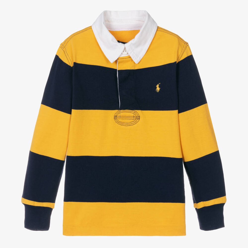 Navy blue and mustard yellow striped rugby shirt for boys by American designer Ralph Lauren. Soft, stretchy and comfortable, it is made in gentle-on-the-skin cotton jersey, great for everyday wear. Undeniably Ralph Lauren, the brand's famous yellow pony logo is embroidered on the front for that cool, preppy look. The top has a classic white twill collar and concealed buttons to fasten on the front.