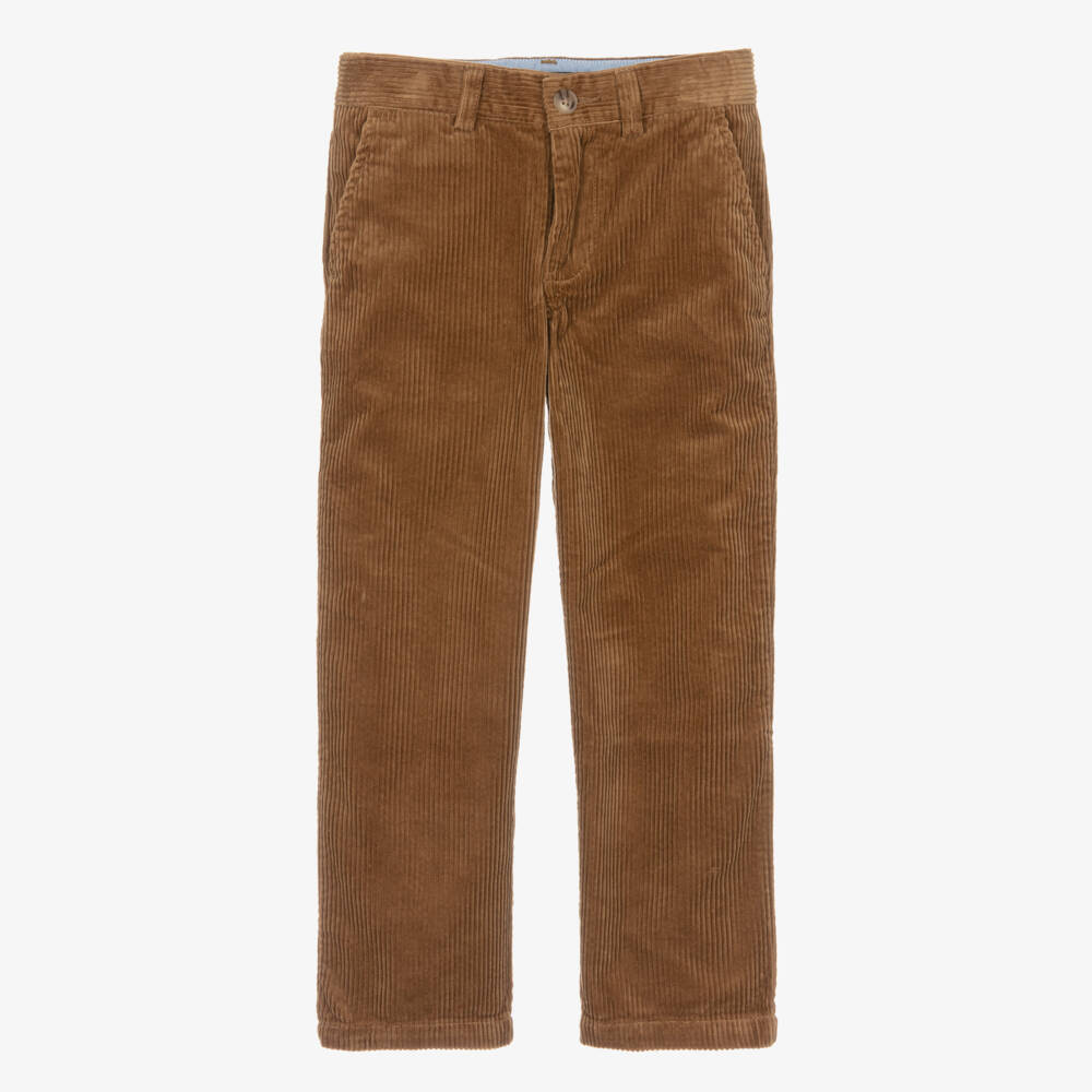 Smart-casual tan brown trousers for boys by Ralph Lauren, made in soft cotton corduroy. In a classic straight fit, they have four pockets and a zip and button fastening. There is an adjustable waist for an ideal fit, with a signature pony logo embroidered in navy blue on the back.