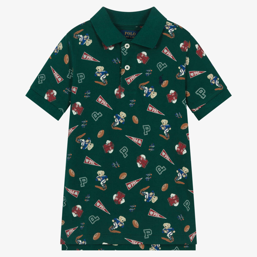Dark green polo shirt for boys by Ralph Lauren, made in comfortable cotton piqué. It is patterned in a colourful collegiate-inspired motif, featuring the brand's iconic Polo Bear mascot playing football. It has a ribbed collar and cuffs, front button fastenings, and a signature pony logo embroidered in blue on the chest.