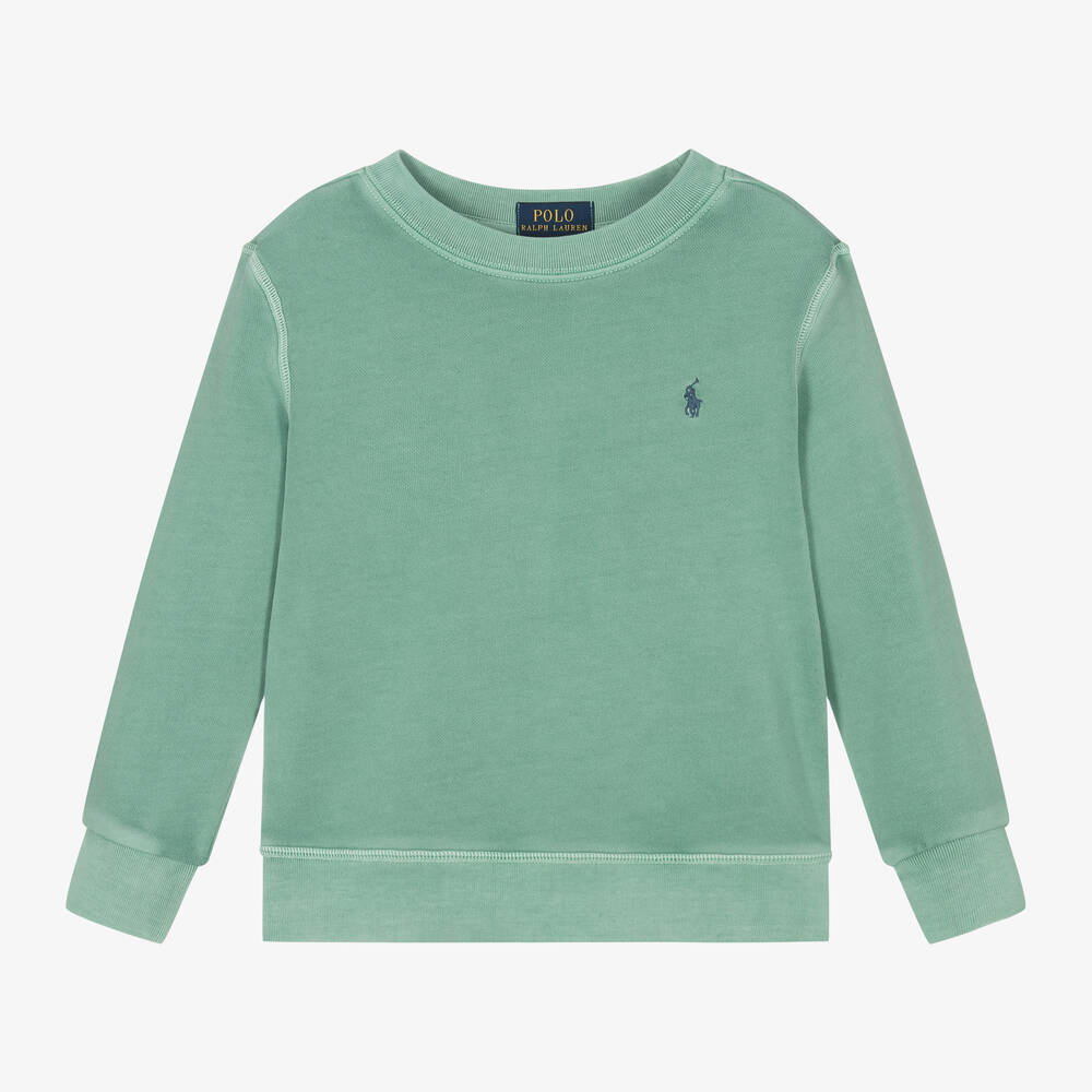 Casual pale green cotton sweatshirt for boys by American brand Ralph Lauren, with a washed and worn look. Endlessly comfortable, it is made in soft, lightweight jersey with overstitch detailing, long sleeves and ribbed trims. It has the instantly recognisable, signature pony logo embroidered on the front in navy blue.