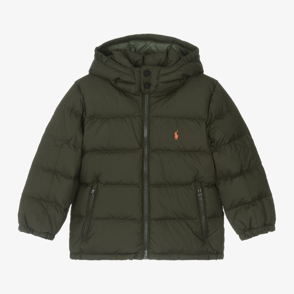 Khaki green puffer jacket for boys by American designer Ralph Lauren. Ideal for cooler days, it is padded in cosy down, with a detachable hood secured with poppers and elasticated cuffs to keep the chilly weather out. There are useful zipped pockets on the front and the label's signature pony logo embroidered in orange on one side for instant brand recognition.