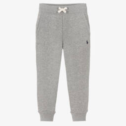 Grey marl cotton joggers for boys by American brand Polo Ralph Lauren, with a navy blue pony logo embroidered on one side. Made in soft comfortable jersey, they have a warm fleecy inside and a stretchy, elasticated waistband with a drawstring for a comfortable fit. There are useful front pockets and a pocket around the back.