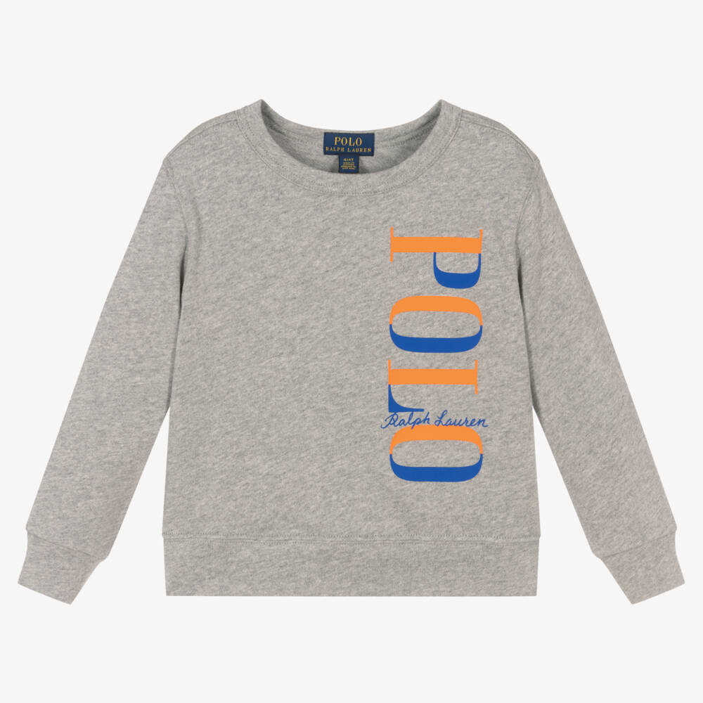 Lightweight grey marl sweatshirt for boys by Polo Ralph Lauren, made in soft cotton jersey. A relaxed casual style, it has an eye-catching logo print on the front in vibrant orange and blue.
