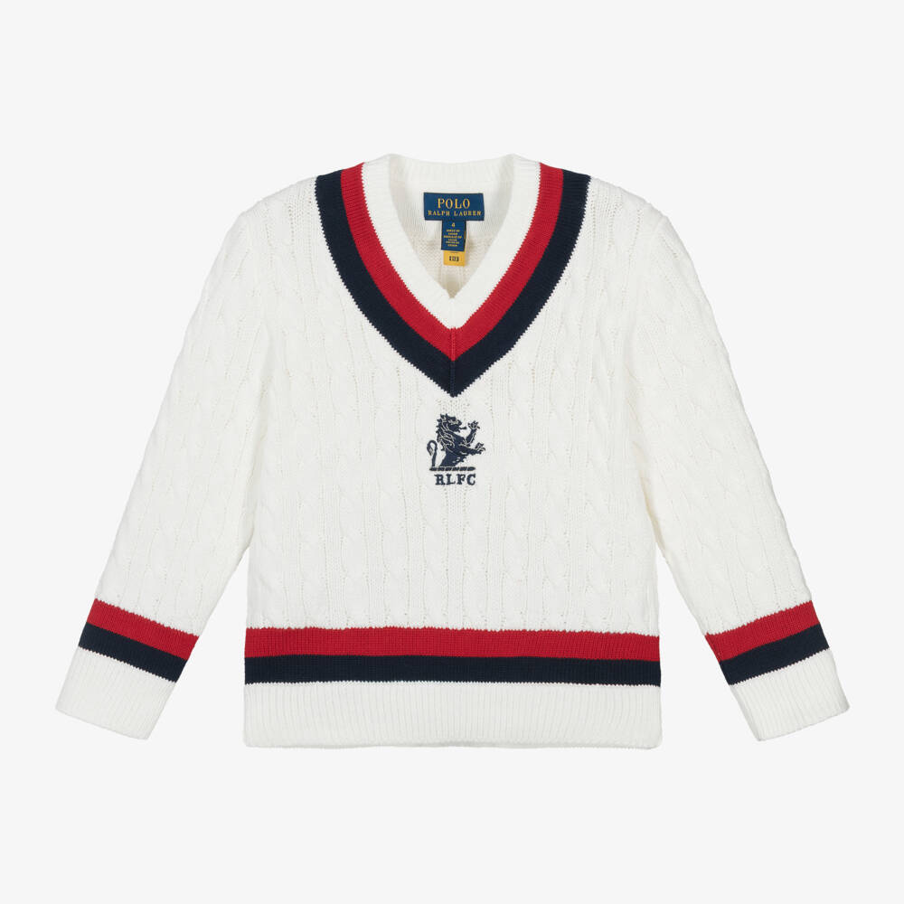 Ivory Mini-me sweater for boys by Ralph Lauren, inspired by the adult collection. Knitted in soft cotton with a cable design, this classic V-neck cricket style has red and blue stripes on the neckline, the long sleeves and the hem. A crest badge with 'R.L.F.C' is embroidered on the chest for a sporty, collegiate feel.