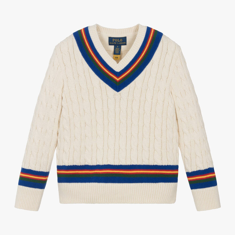 A classic ivory cricket jumper for boys by American label, Ralph Lauren. Knitted in combed cotton yarn and washed for softness, this traditional style has a distinctive cable pattern and ribbed trims. The look is complete with colourful striped trim on the V-neck, cuffs and hem.