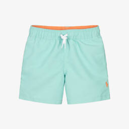 Lime green swim shorts for boys by Ralph Lauren, with the brand's signature Pony logo embroidered in pink on one leg. These vibrant swim shorts are made in silky smooth recycled fabric, with a soft mesh lining. They have useful side seam and back pockets and a drawstring waistband for a comfortable fit.