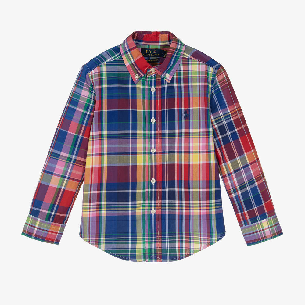 A vibrant multicolour checked shirt for boys by American brand Ralph Lauren. Ideal for smart-casual wear, it is woven in smooth cotton poplin, with long sleeves and a button-down collar. There are button fastenings on the front and cuffs, with a signature pony logo embroidered on the chest in tonal blue.