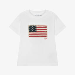 Navy blue T-shirt for boys by Ralph Lauren, featuring the brand's signature American flag design and RL logo embroidery. Made in soft cotton jersey, this casual tee has a classic crew neckline and short sleeves.