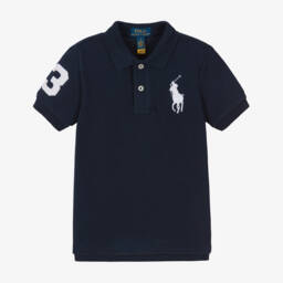 Navy blue polo shirt for boys by Ralph Lauren, made in soft cotton piqué. Cool and casual, it features the brand's signature Big Pony logo embroidered on the chest and a number 3 appliquéd on one sleeve for a sporty finish. It has a classic ribbed collar and a two-button placket.