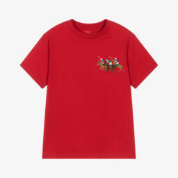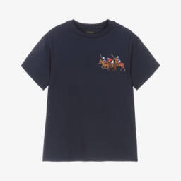 Navy blue cotton T-shirt for boys by Ralph Lauren, with the designer's Triple Pony logo embroidered on the front for instant brand appeal. Casual and comfortable, it is made in soft jersey with a classic ribbed crew neckline.