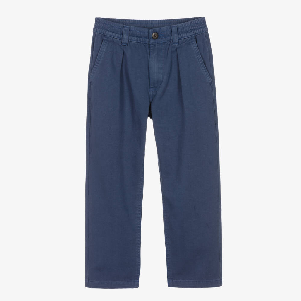 Casual chino-style trousers for boys by Ralph Lauren, in a washed navy blue shade. Made in soft cotton twill, they have pleats on the front for a comfortable relaxed fit. The elasticated waistband has an internal drawstring tie and they fasten with a zip and button. There are slanted front pockets and a single back patch pocket with an embroidered signature pony logo above for a discreet designer finish.
