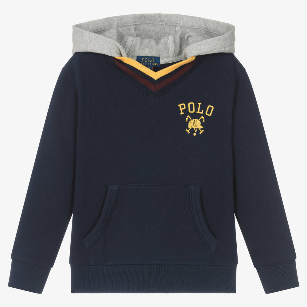 A navy blue hoodie for boys designed by Ralph Lauren. With double-layer styling, it has an attached grey hood and a striped V-neckline in yellow and burgundy red, a preppy look the brand is renowned for. It is made in mid-weight cotton-mix jersey, with a fleecy-feel underside for cosy comfort. Yellow varsity polo logo embroidery and a front pouch pocket complete the design.